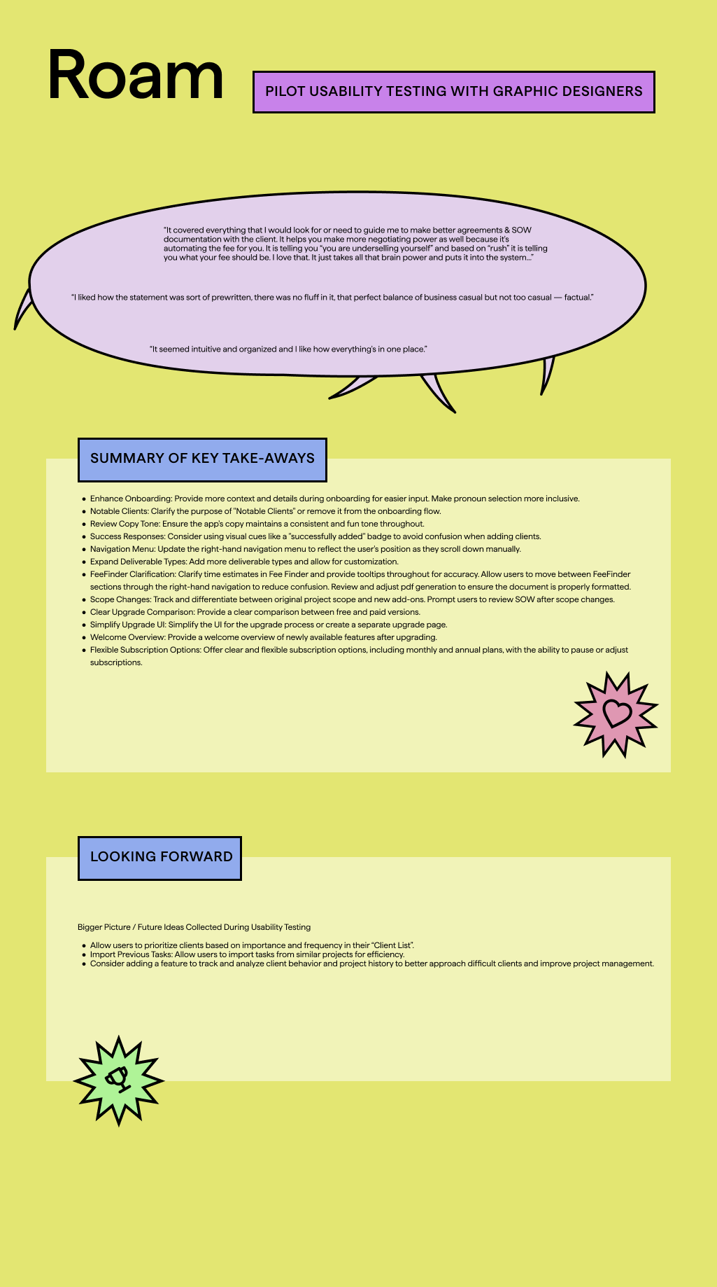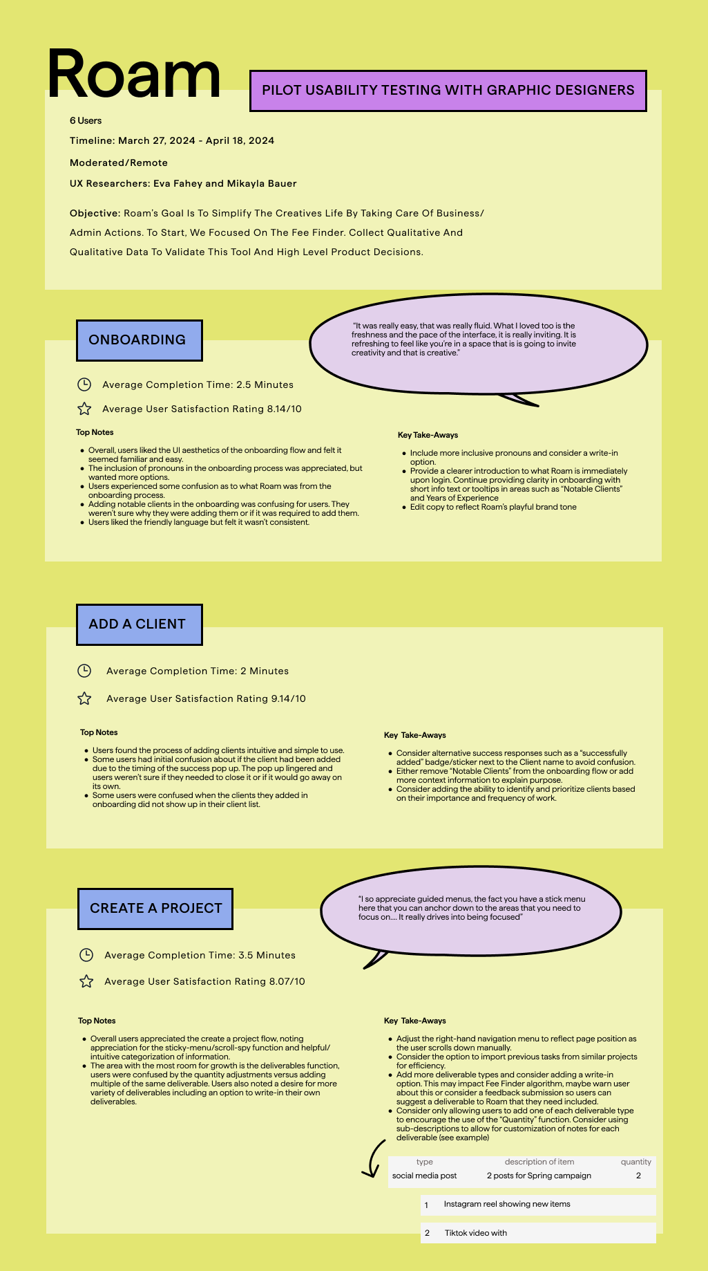 I designed, conducted, and synthesized usability testing at Roam to make key suggestions to the development team and ensure the product was ready for launch.